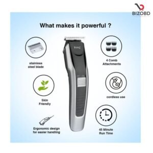 HTC AT-538 Trimmer পুরুষদের জন্য একদম পারফেক্ট একটি রিচার্জেবল ট্রিমার — চুল, দাড়ি বা গোঁফ সবকিছুর জন্য ব্যবহার করা যায়।